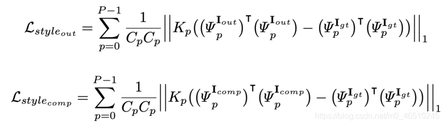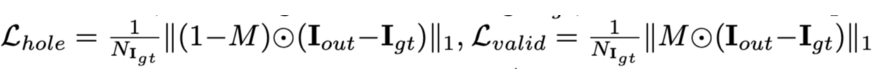 其中I_out和I_gt分别是网络的输出和真实值。M是二进制掩码,0表示孔,1表示有效像素。N_I_gt是图像中像素值的总数,等于C×H×W,C是通道大小(对于RGB图像为3),H和W是图像I_gt的高度和宽度。您可以看到L_hole和L_valid分别是空像素和有效像素的L1损失。