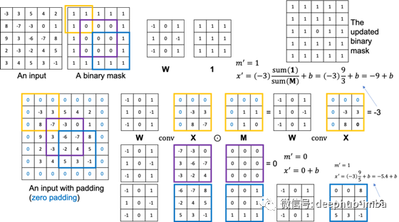考虑到中间(紫色边界)框,这次卷积没有有效的输入值,所以结果是0+b,更新后的掩码值也是0。右下(蓝色边界)框是显示缩放因子作用的另一个卷积示例。通过比例因子,网络可以将由3个有效输入值计算得到的-3和由5个有效输入值计算得到的-3区分开来。
