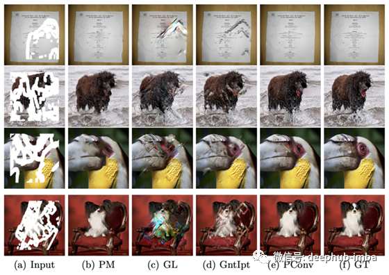 在ImageNet上对不同方法进行可视化比较。(a)输入图像(b) PatchMatch (c) GLCIC (d) context Attention (e) PConv (f) 真实图像