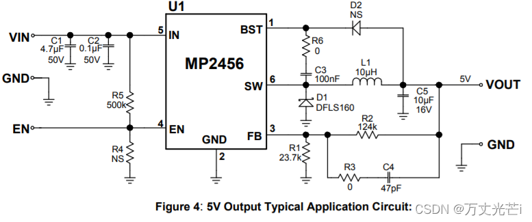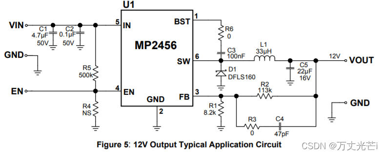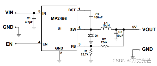 5.IN:电源电压。MP2456工作在4.5 v到50v的非稳压输入。要求C1防止输入端出现大电压尖峰。