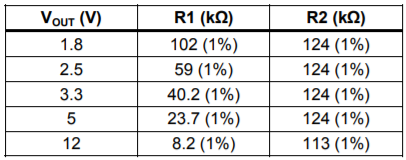 1.外部电阻分压器设置输出电压,下表列出了常用输出电压的电阻。反馈电阻(R2)也通过内部补偿网络设置反馈回路的带宽(见下表)。R1为