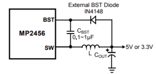 在这些情况下,添加一个外部BST二极管从电压调节器的输出到BST引脚,如下图所示: