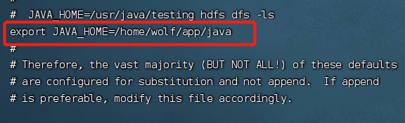 - 接着配置下/home/wolf/app/hadoop/etc/hadoop/ hadoop-env.sh