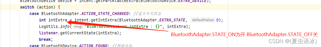1.1通过BluetoothAdapter.getDefaultAdapter();拿到蓝牙适配器,其中isEnabled()可直接返回当前蓝牙状态。