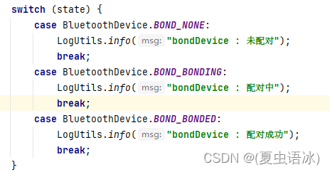 filter.addAction(BluetoothDevice.ACTION_BOND_STATE_CHANGED); //配对状态