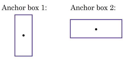 首先,我们预先定义了两种不同的形状,称为锚盒。对于每个网格,我们将有两个输出,而不是一个输出。我们也可以随时增加锚框的数量。在这里拿了两个来使这个概念易于理解: