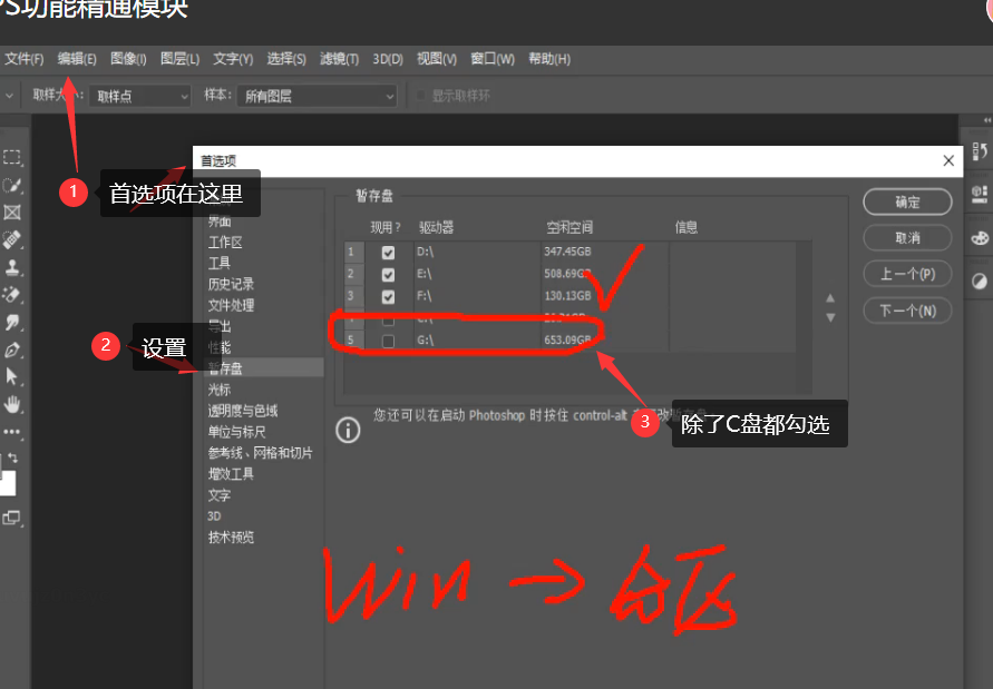 7.调整ps:编辑—首选项—暂存盘 快捷键ctrl+k 勾选所有硬盘可缓解卡顿。