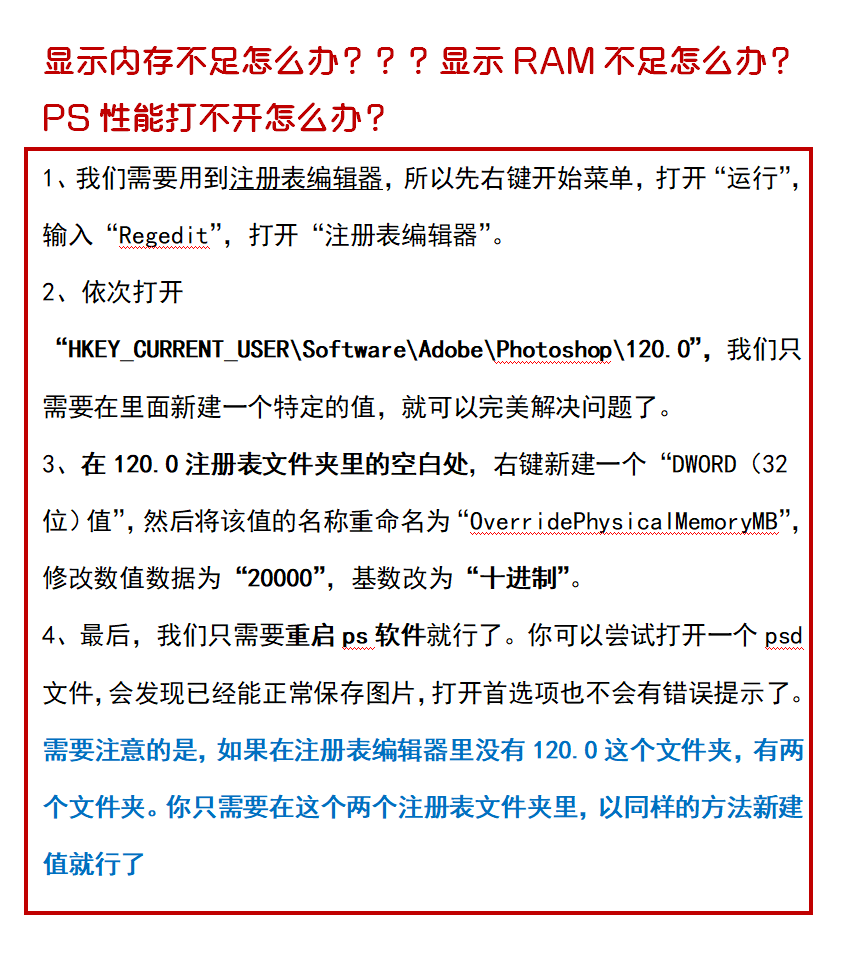 ①首先,找到电脑右下角的开始菜单按钮,然后鼠标右键,找到运行并点击。或者WIN+R在运行输入框内输入regedit,然后点击确定。②按路径展开HKEY_CURRENT_USER\Software\Adobe\Photoshop\120.0。(注意不同版本数值不一样,有的是110,有的是100,按照自己的选择)