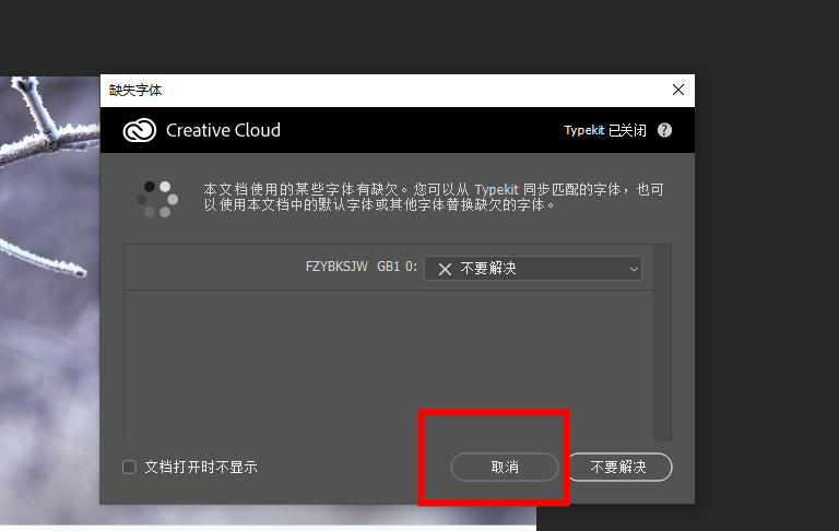 - 打开psd源文件文档时出现下方界面点击取消即可:(由于电脑没有此文件使用的字体,所以会出现如下显示,字体方面不用担心,万万后续会陆续给到大家各种字体包的哦~)