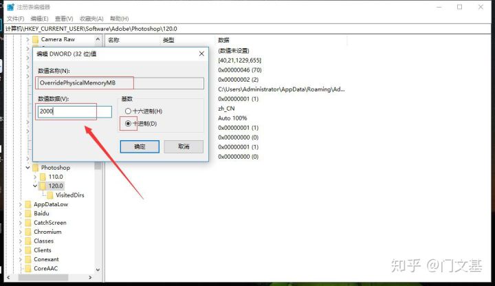 ④接着双击新建的OverridePhysicalMemoryMB,数值数据输入2000,然后选择十进制。