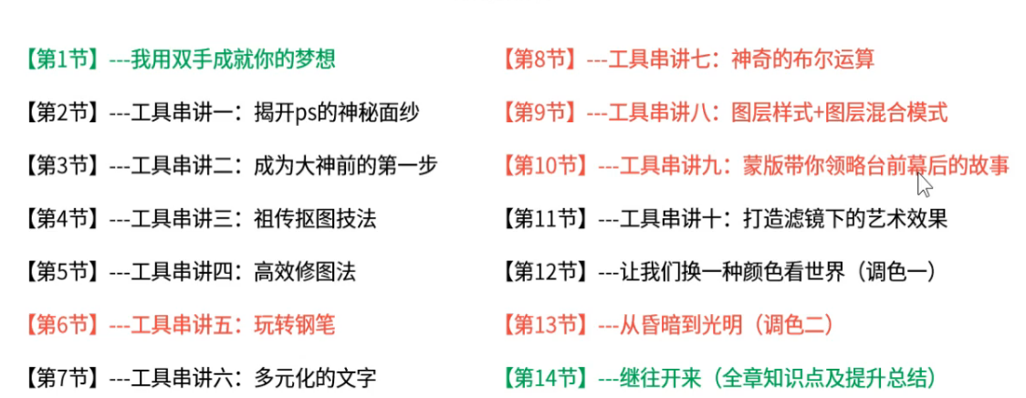红色是比较重要的课程,除了1和14节没有练习素材,其他部分都上传了案例相关的素材和高清笔记