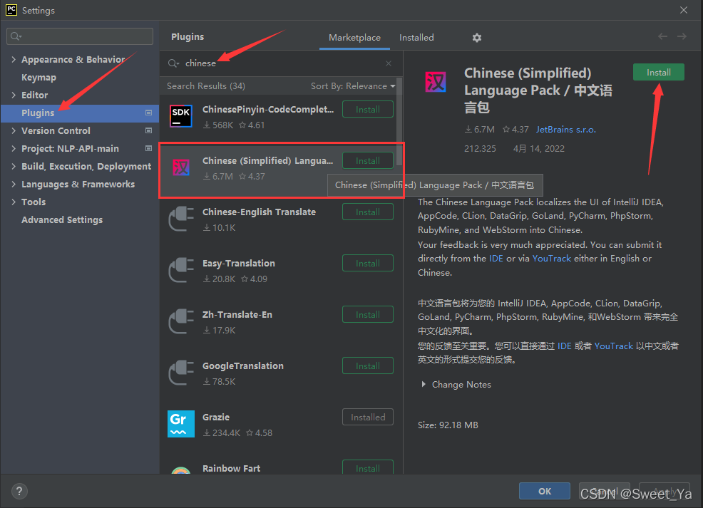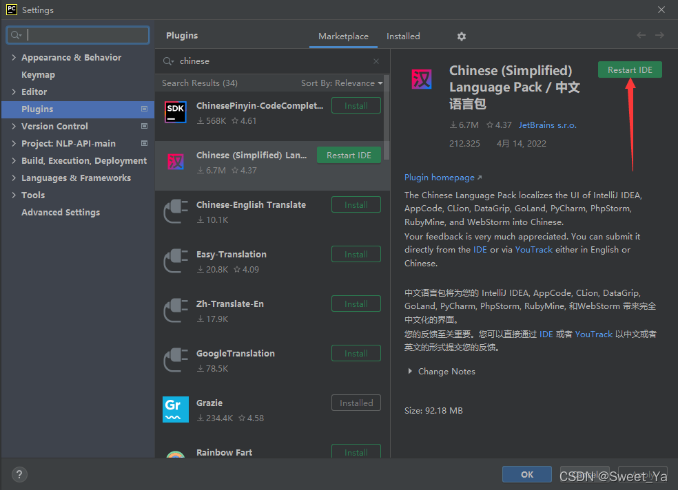 进入Settings,找到plugins,在搜索框中输入Chinese,下载相应的中文包,点击apply,一定要点击应用,即点击右下角的apply按钮,然后点击重启一下就可以了