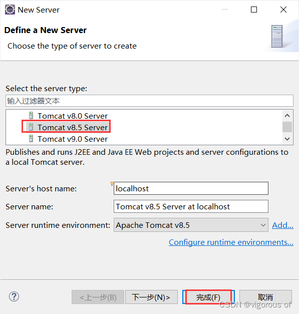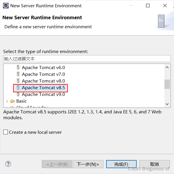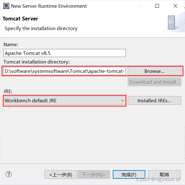 3、选择自己下载的tomcat对应版本,我这里以Tomcat8.5为例,点击下一步,选择自己下载好的tomcat存放的目录路径 ,JRE使用系统默认的也行,手动选择也行,点击完成,点击Apply and Close