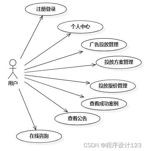 用户:注册登录、个人中心、广告投放管理、投放方案管理、投放报价管理、查看成功案例、查看公告、在线咨询。