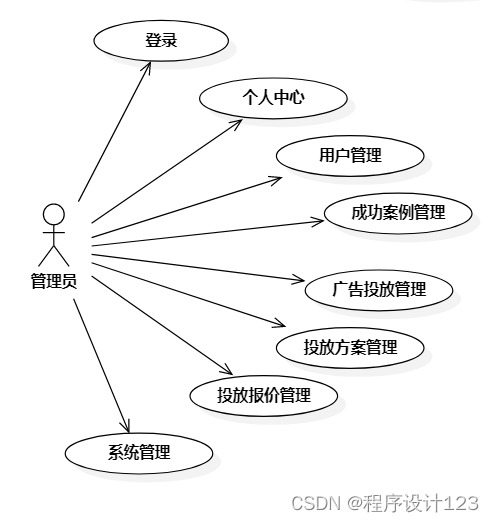 管理员:登录、个人中心、用户管理、成功案例管理、广告投放管理、投放方案管理、投放报价管理、系统管理。