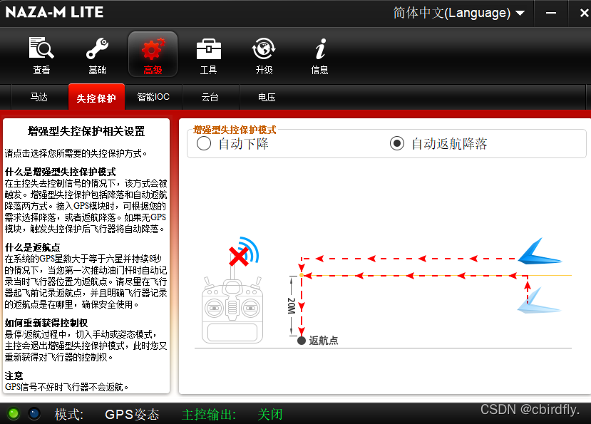 6.失控保护,这个要前面遥控器也设置一下,这个主要是遥控器信号没了,它会自动返航。具体可以看说明书。