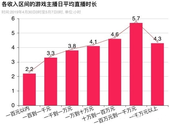 图表中的趋势告诉我们:是的。总收入一百元以内的直播,平均每日直播2.2小时,而总收入一百万到一千万的主播,平均每日直播5.7小时!