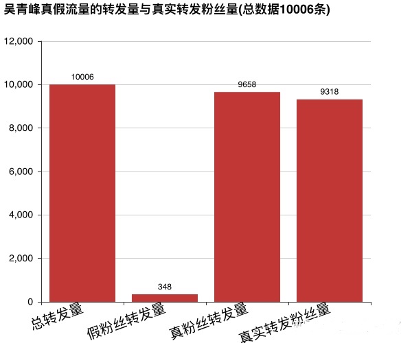 与之相比,吴青峰10006条转发数据中,只有很少比例的假粉丝量,绝大部分都是真粉丝转发的。在9658条真粉丝转发数据中,真粉丝量也高达9318,说明不存在粉丝打榜的情况。