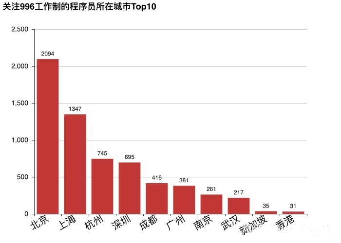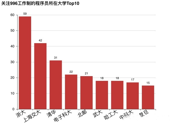 关注996工作制的程序员中,有程序员大牛。排名第一的是一个熟悉的面孔,轮子哥!另外有来自腾讯的Coco,来自滴滴的singwhatiwanna,技术博主颜海镜等,这些人都在关注996。在39987个star了该repos的程序员中,粉丝数大于1000的有47人,大于500的有110,大于100的有598人。说明还是有很多有影响力的程序员在关注996工作制。