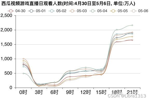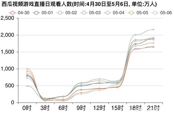 可以看到,节假日的观看人数要比非节假日高。每日观看人数从7点开始攀升,到12点达到小峰值(500万左右),再从下午的4点开始急剧攀升,下午6点的观众人数,是12点的3-4倍。说明观众习惯下午下班后打开APP观看直播。下午6点一直到晚上12点,都是直播的黄金时间。