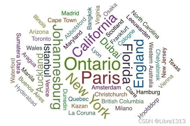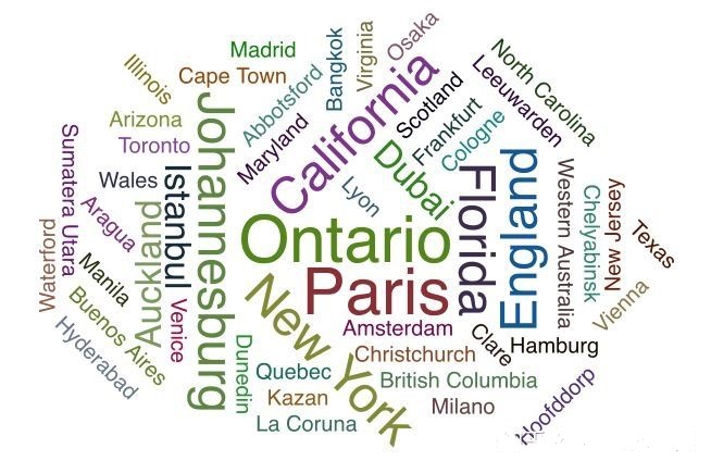 我们把外教群里的外教来源省份画了出来,可以看到,有来自美国纽约的、有来自加拿大多伦多的,有来自英格兰的,当然,也有来自法国巴黎的(法语)、有来自土耳其伊斯坦布尔的(土耳其语)、有来自荷兰阿姆斯特丹的(荷兰语),有来自西班牙拉科鲁尼亚的(西班牙语),还有来自其它各种各样地方的,你们自己感受一下。