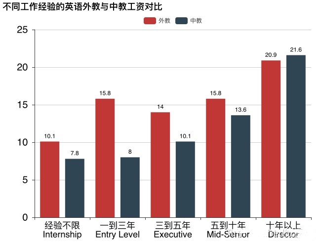 大部分中教的工资都在10K以内,而大部分的外教工资都在10K以上。中教的月平均工资是8.3K(按照城市为单位平均后是7.9K),而外教的月平均工资是15.7K,大概是中教的2倍。