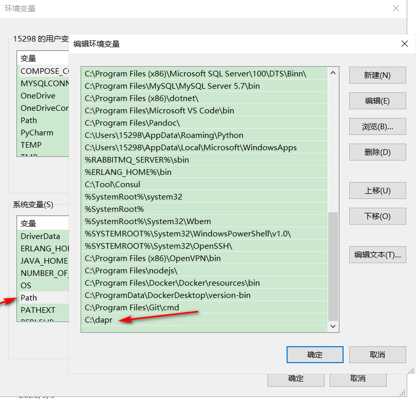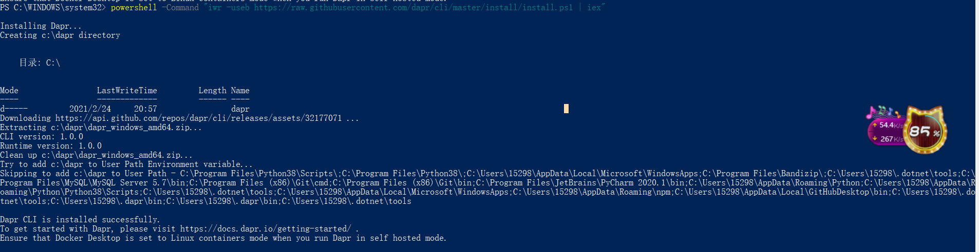打开 Windows PowerShell 或 cmd ,运行以下命令以安装 Dapr CLI,并添加安装路径到系统环境变量中。