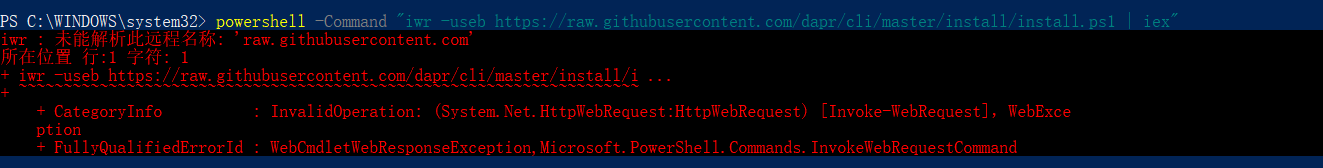 powershell -Command "iwr -useb https://raw.githubusercontent.com/dapr/cli/master/install/install.ps1 | iex"