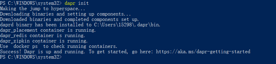 在 Windows PowerShell 或 cmd 中使用命令 dapr init 以安装 Dapr Runtime