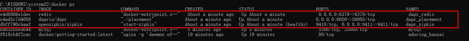 docker ps 查看容器:安装了三个容器 ,dapr_zipkin,dapr_placement,dapr_redis