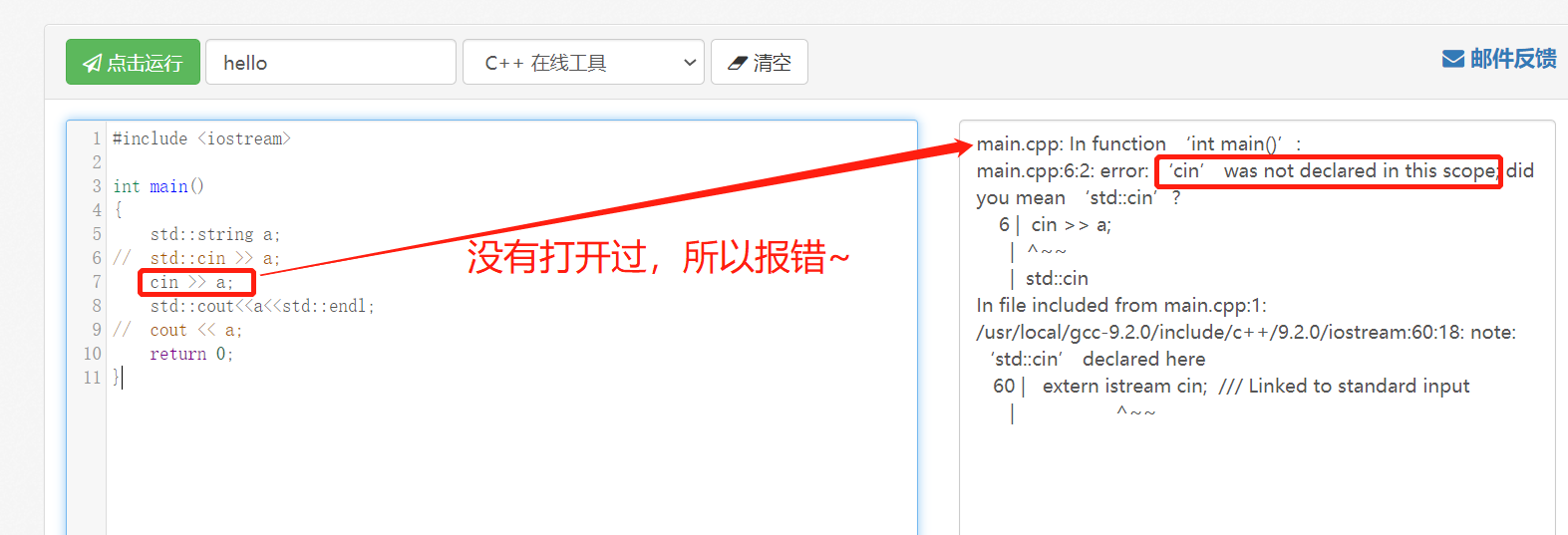 // cin >> a; //没有打开,会报错std::cout<<a<<std::endl; //运行结果与上面相同