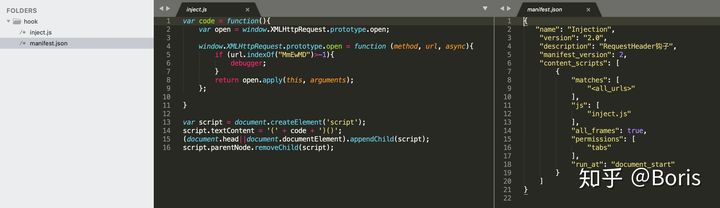 - 如图所示,创建一个文件夹,文件夹中创建一个钩子函数文件inject.js 及 插件的配置文件 manifest.json 即可