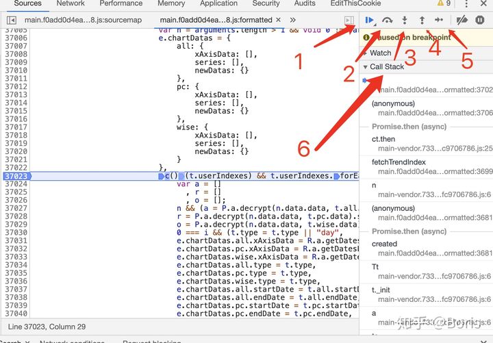 1.执行到下一个端点 2.执行下一步,不会进入所调用的函数内部 3.进入所调用的函数内部 4.跳出函数内部 5.一步步执行代码,遇到有函数调用,则进入函数 6.Call Stack 为代码调用的堆栈信息,代码执行顺序为由下至上,这对于着关键函数前后调用关系很有帮助