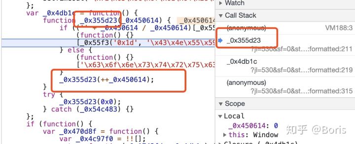 从原函数中可以看到这是一个无限递归的函数,目的就是当你开启了检查工具时,出现无数次debug,阻止你debug调试。那么我们重写这个函数就可以了,在Console 一栏中使用匿名函数给本函数重新赋值,这样就把_0x355d23函数变为了一个空函数,达到了破解无限debugger的目的