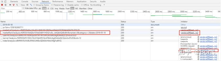 可以在 Network 选项卡下,该请求的 Initiator 列里看到它的调用栈,调用顺序由上而下: