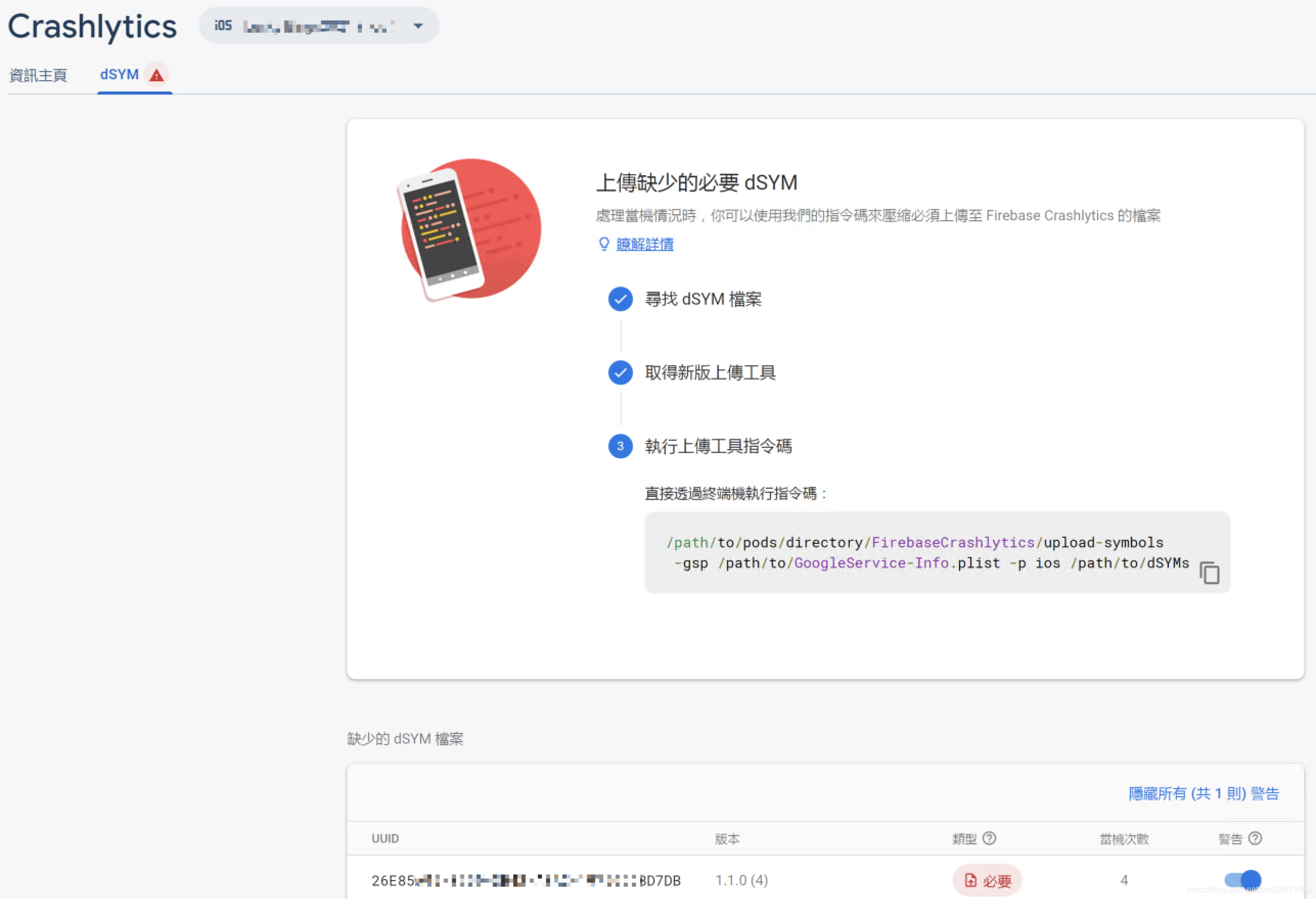 Firebase后台提示缺失dSYM文件的截图