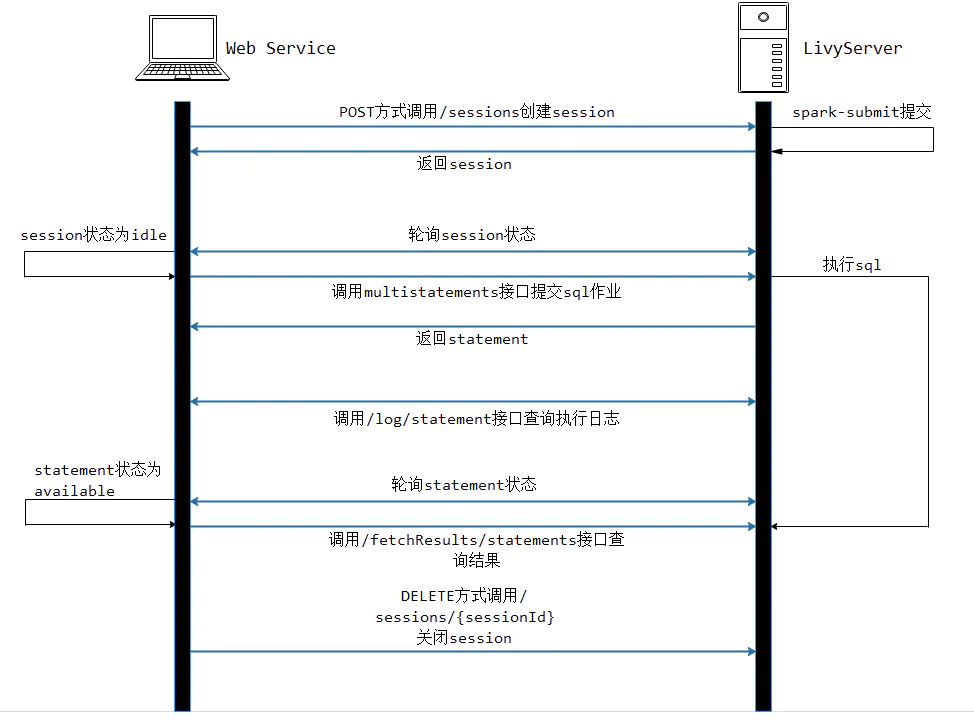 3. 在livy的原生代码中,提交查询之前需要创建一个session,也就是启动一个driver,等driver启动好并且与本地客户端建立好连接,才能提交sql至该session中,session启动中的状态为starting,此时若提交sql,则会返回'session is in starting'错误;因此客户端需要不断轮询session的状态,直到session的状态变为running为止。为了提高用户的交互式体验,我们对这块的逻辑做了变动,当session创建成功之后就可以提交sql,但此时将sql缓存在livy server中,由livy server不断去轮询session的状态并且负责提交。