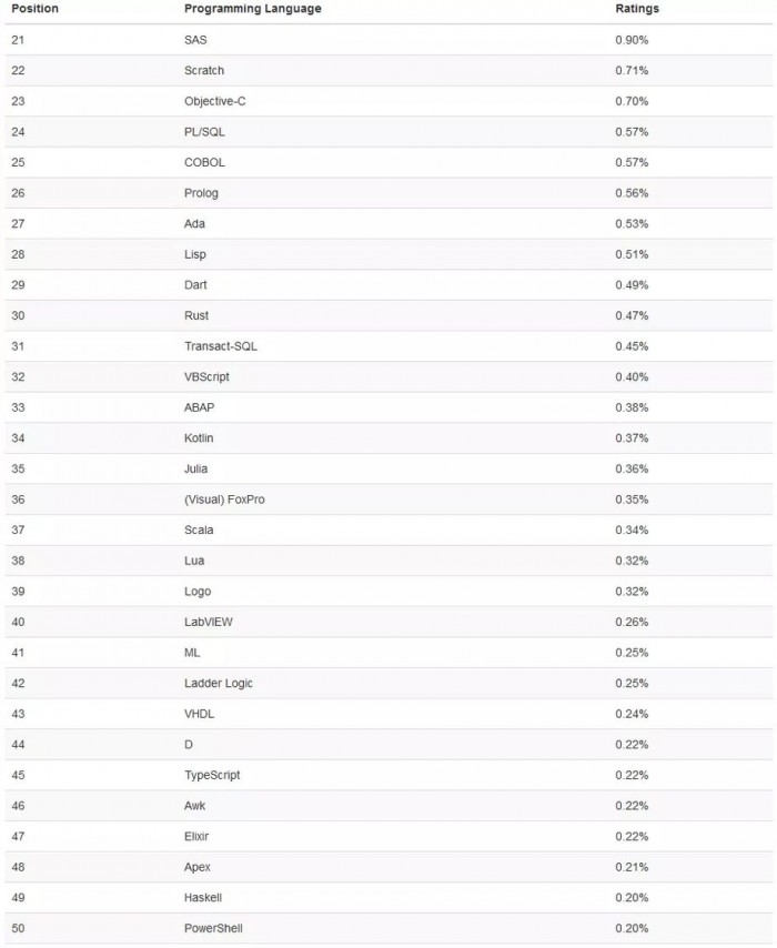 另外,近几个月间,我们发现 Java 的市场份额在持续下降,市场份额比上个月少 0.2%,且其增长趋势为 -4.56%。除此之外,TOP 20 中还有一些值得关注的变化: