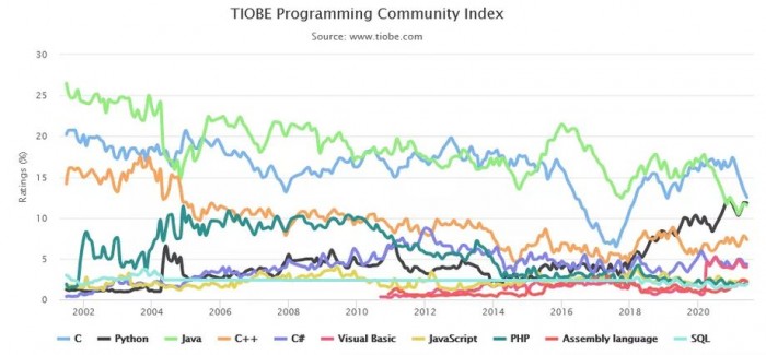 Top 10 编程语言 TIOBE 指数走势(2002-2020)