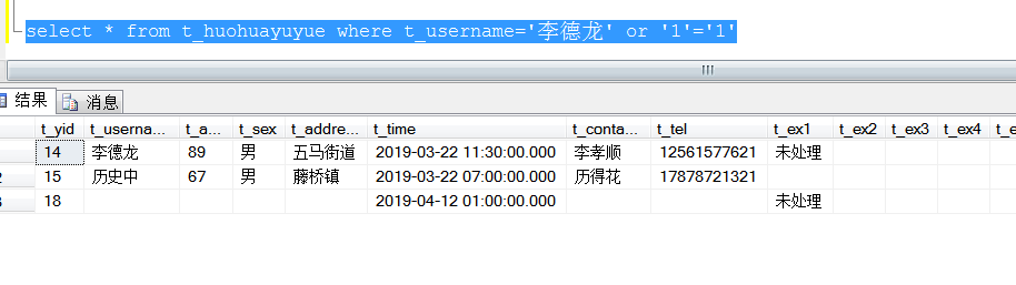 select * from t_huohuayuyue where t_username='李德龙' or '1'='1'