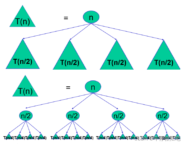 算法思想:规模为n的原问题的解无法直接求出,进行问题规模缩减,划分子问题(这里子问题相互独立而且和原问题解的性质是相同的,只是问题规模缩小了)。如果子问题的规模仍然不够小,再进行子问题划分,如此递归的进行下去,直到问题规模足够小,很容易求出其解为止,最后将求出的小规模的问题的解合并为一个更大规模的问题的解,自底向上逐步求出原问题的解。