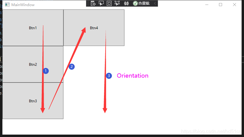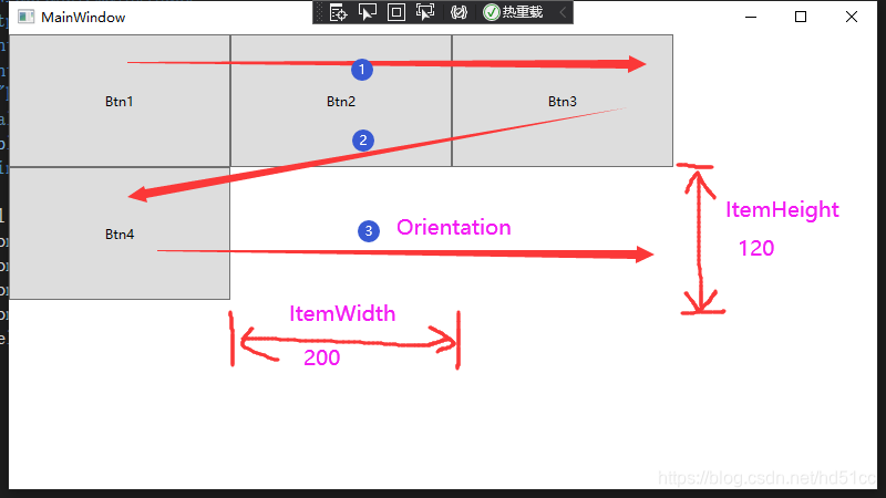 <Window x:Class="WrapPanel.MainWindow"xmlns="http://schemas.microsoft.com/winfx/2006/xaml/presentation"xmlns:x="http://schemas.microsoft.com/winfx/2006/xaml"xmlns:d="http://schemas.microsoft.com/expression/blend/2008"xmlns:mc="http://schemas.openxmlformats.org/markup-compatibility/2006"xmlns:local="clr-namespace:WrapPanel"mc:Ignorable="d"Title="MainWindow" Height="450" Width="800"><Grid><WrapPanel ItemHeight="120" ItemWidth="200" Orientation="Vertical"><Button Content="Btn1" /><Button Content="Btn2" /><Button Content="Btn3" /><Button Content="Btn4" /></WrapPanel></Grid>