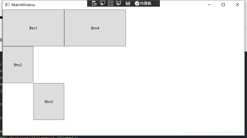 <Window x:Class="WrapPanel.MainWindow"xmlns="http://schemas.microsoft.com/winfx/2006/xaml/presentation"xmlns:x="http://schemas.microsoft.com/winfx/2006/xaml"xmlns:d="http://schemas.microsoft.com/expression/blend/2008"xmlns:mc="http://schemas.openxmlformats.org/markup-compatibility/2006"xmlns:local="clr-namespace:WrapPanel"mc:Ignorable="d"Title="MainWindow" Height="450" Width="800"><Grid><WrapPanel ItemHeight="120" ItemWidth="200" Orientation="Vertical"><Button Content="Btn1" /><Button Content="Btn2" Width="100" HorizontalAlignment="Left"/><Button Content="Btn3" Width="100" HorizontalAlignment="Right"/><Button Content="Btn4" /></WrapPanel></Grid>