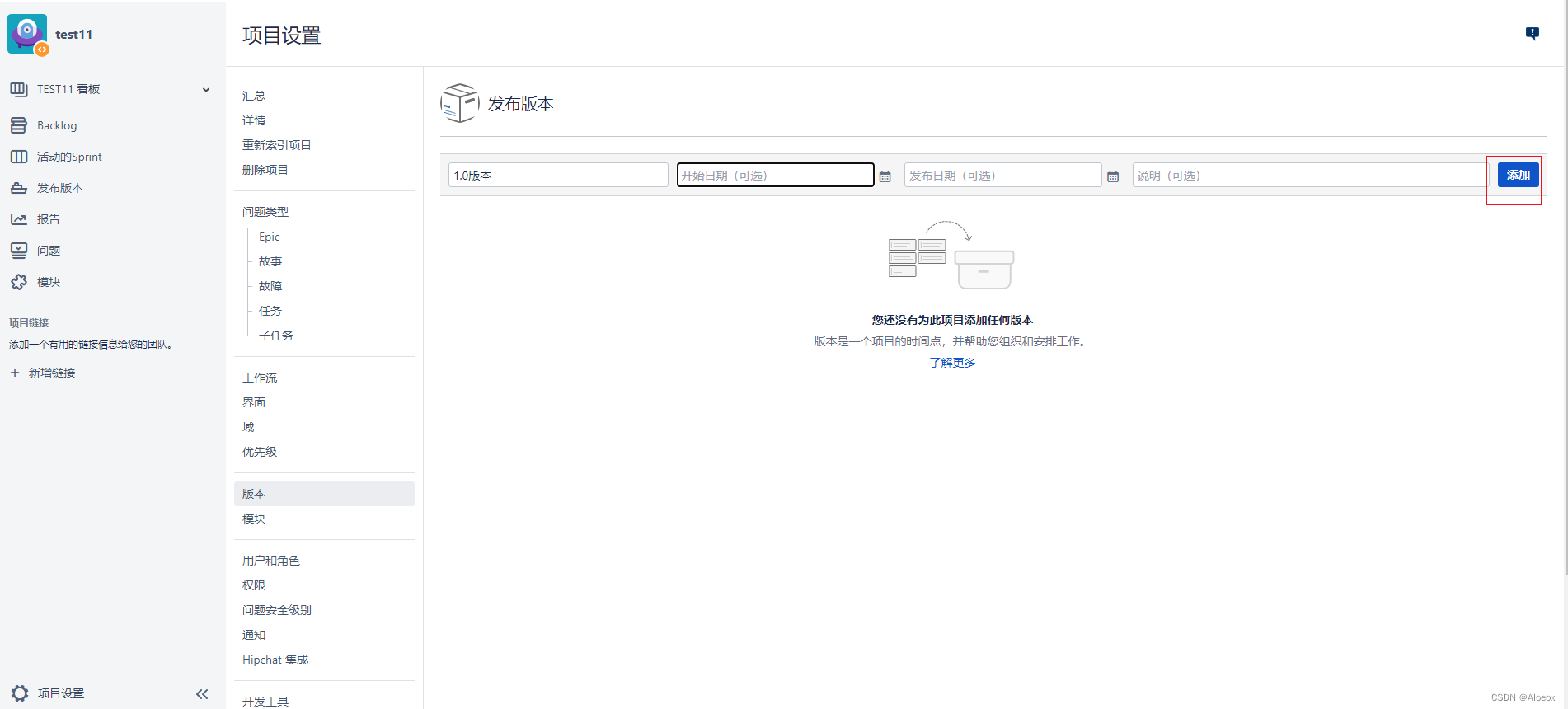 16)版本设置:输入版本名称,开始日期和发布日期即可。有说明可以添加上,若无可以不用添加。写好了直接点击添加按钮即可。注意:如果是一个项目多次迭代更新,每次迭代更新为一个版本,依次顺延,默认从1.0版本开始。
