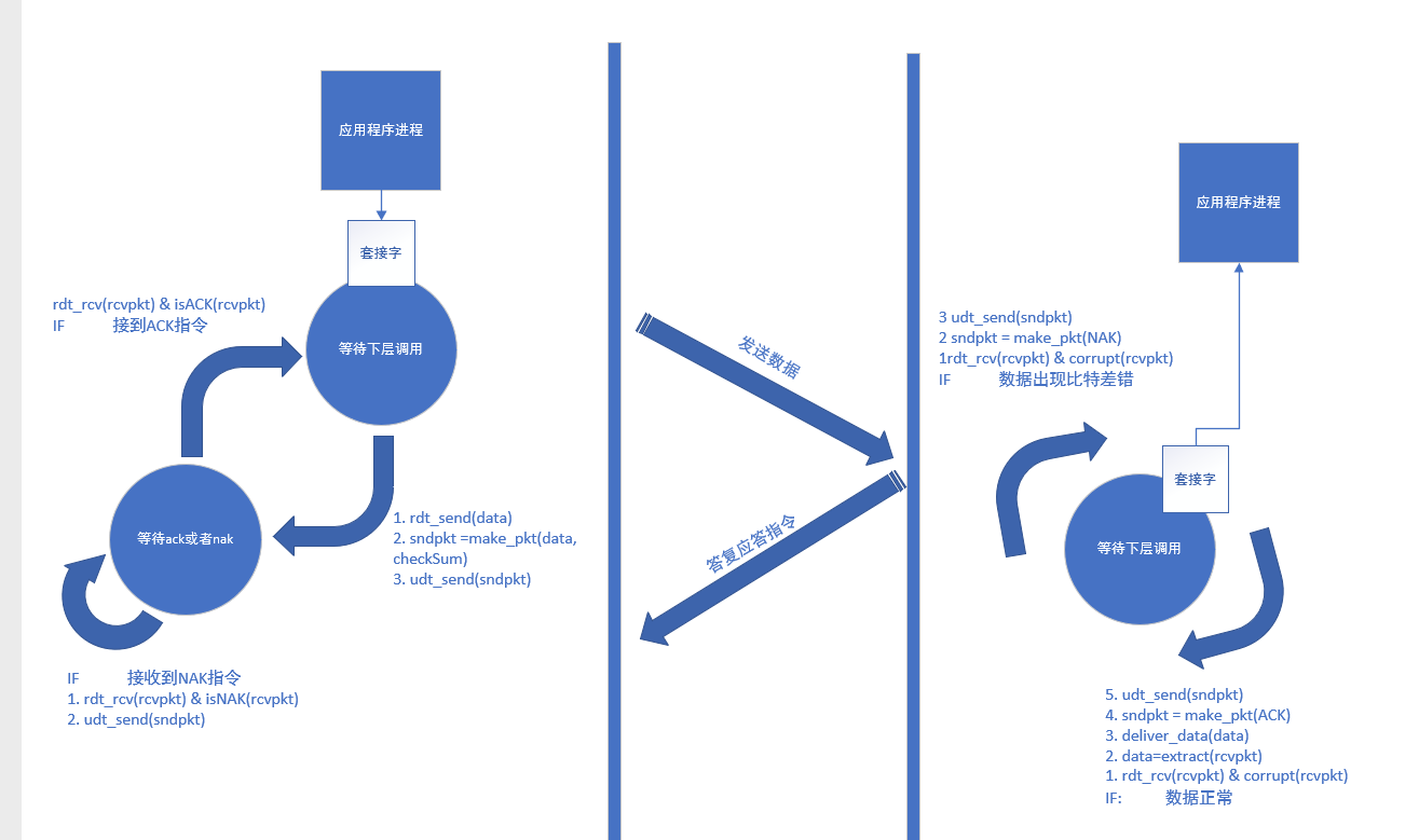 需要注意的是: 由于在这里讨论的rdt协议采用了停等协议。因此, Sender端在等待ACK 和 NAK 答复指令的时候, 处在阻塞的状态。