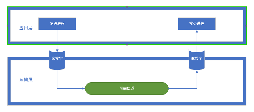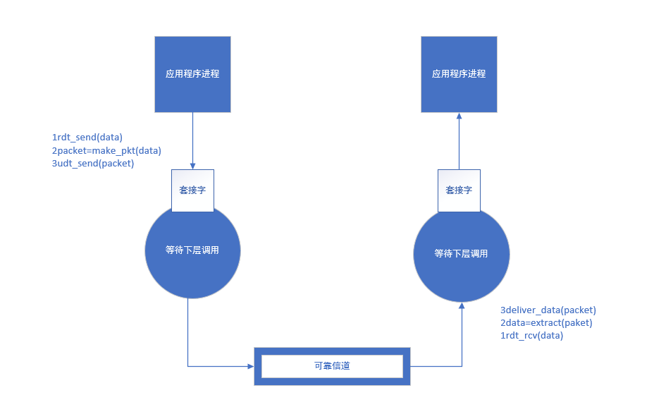运行在应用层中的客户端(服务端)应用程序进程通过套接字将数据推送到运输层。同样地, 有服务端(客户端)进程通过套接字接受来自运输层的数据。对应用层而言, 它所能看到的底层就是一条可靠的信道(如图 2.2 所示)。但是,对于现实中的数据传输,由于受到噪声干扰、网络拥堵等各种影响,难免会出现数据受损、丢包等事故, 而rdt协议就是为了解决这样一个问题,而诞生的。