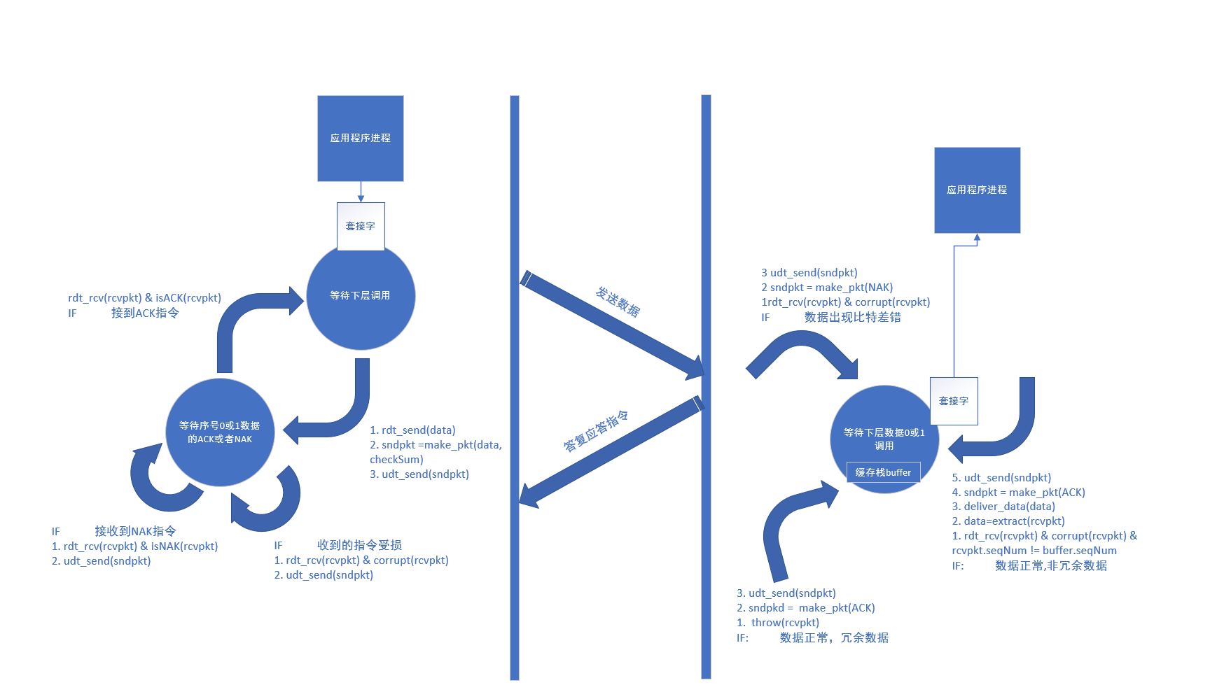 - 3. 接收到ACK指令, Sender端不再阻塞, 可以发送新的数据 1 或 0, 状态迁移到 等待来自上层调用
