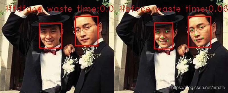 这两幅测试图片有鲜明代表性,一幅是只有2个人脸,另一幅是有好多个人脸的。ssdface和libface的运行速度最快,但是在有密集人脸的场景里,它们漏检了很多人脸。综合两幅图片的检测结果,考虑检测准确率和运行耗时的折中权衡,retinaface和lffdface是最优选择。retinaface运行耗时虽然比lffdface的要略长一点,但是retinaface的输出里有5个关键点。