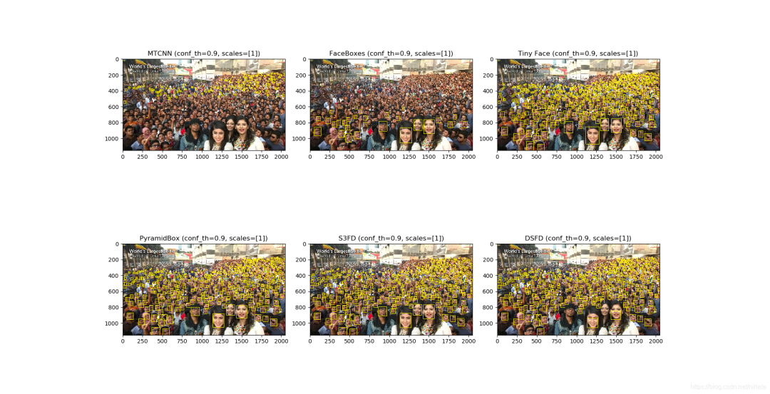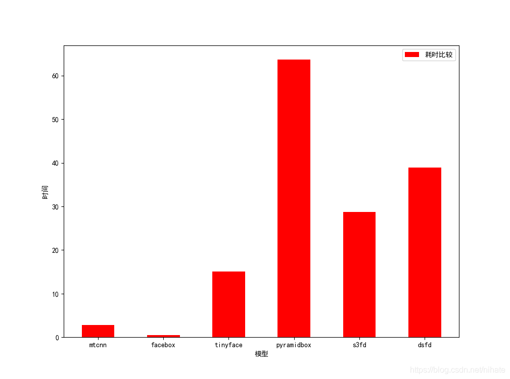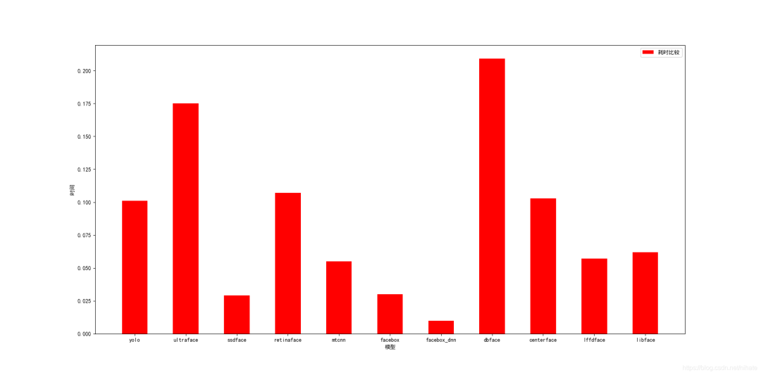 去年在Github下载过一个包含6种人脸检测的程序,分别是Pyramidbox,DSFD,S3FD,TinyFace,FaceBox,MTCNN,但是这些算法大多是重量级的网络模型,它在一幅图片上的人脸检测结果和运行耗时统计直方图如下。