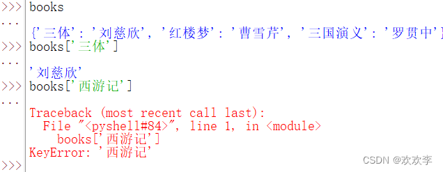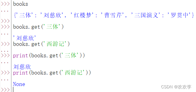区别:get(key):里面的key如果不存在则返回None,同时get(key,默认值)可以设置默认值